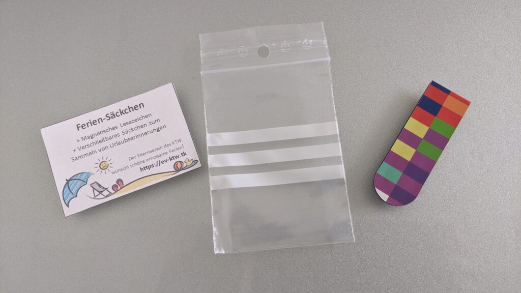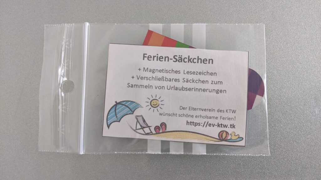 Posted on Juli 1, 2021September 2, 2021 Alle Schüler, Lehrer und die Nachmittagsbetreuung erhalten vom Elternverein ein Ferien-Säckchen. Inhalt: Ein magnetisches Lesezeichen, das kleine verschließbare Säckchen kann zum Sammeln von Urlaubserinnerungen verwendet werden (up-cycling) By Redakteur Archiv Information