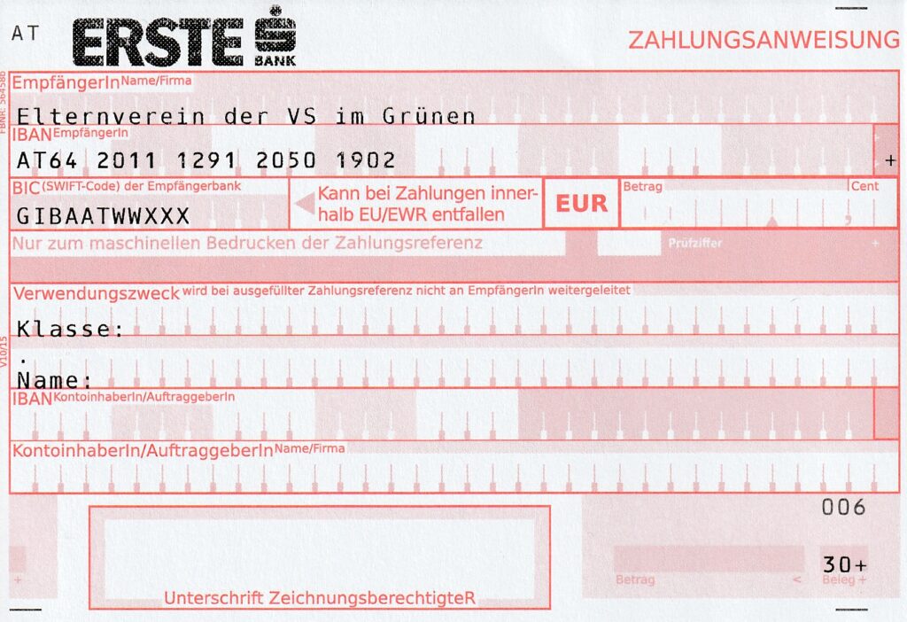 Wir bitten sie den Elternvereins-Beitrag so bald wie möglich auf folgendes Konto einzuzahlen: